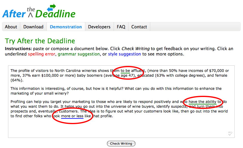 So whether you’re writing an article or posting a comment, you simply need to hit the After the Deadline button in your browser and it will create the green and red underlines that we’re so familiar with in our offline word processing programs.