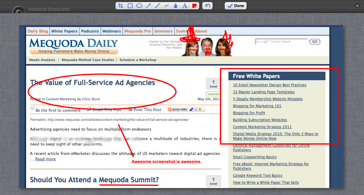 At Mequoda, we use screenshots all the time, and I know a lot of other bloggers need to use them every once in a while too. Sometimes, it can get tedious to take a screenshot, bring it into Photoshop, add circles, save for web, and run through that whole process.