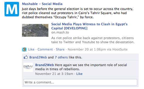 One quick way to get extra eyes on a post is to tag the businesses that you mention inside of your post. If you’re a consumer magazine, you might mention a brand that you featured in the article. In this example from Mequoda, I’ve included tags to all of the fine folks who offered up tips in this article. Now, this post shows up on the walls of everyone I’ve tagged.