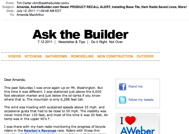 Now here’s a promotional email from Tim Carter of AskTheBuilder.com, who is promoting a few products and a white paper in this email: