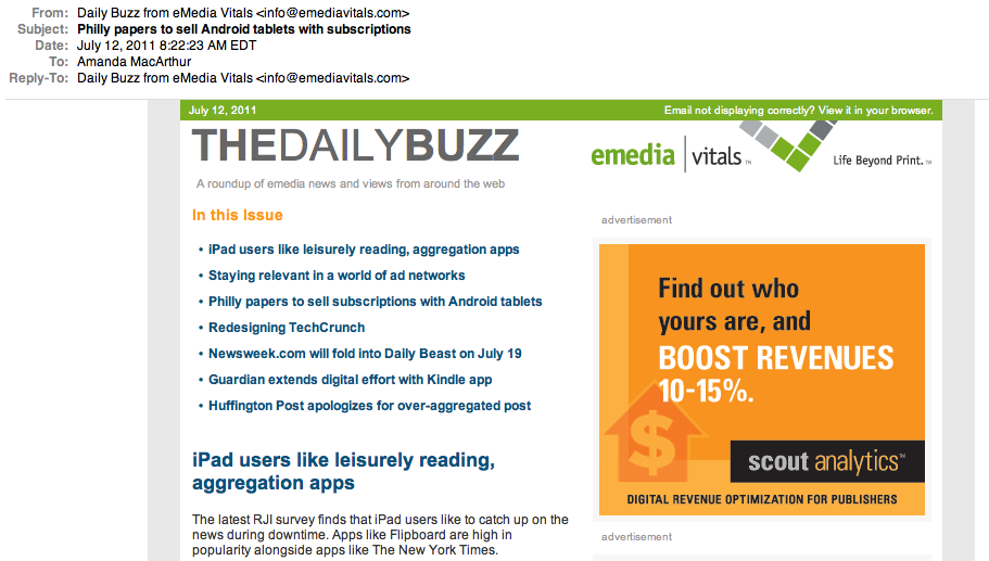 The Daily Buzz from eMedia Vitals offers a jam-packed email newsletter, offering all of their stories right in the beginning, to entice readers to scroll down. As an ad-driven website, they’ve also given ample space for a big square ad to the right as well.