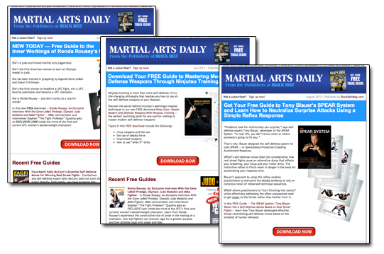 Black Belt‘s email newsletter is called Martial Arts Daily. From what I’ve heard, they chose Martial Arts Daily as the title of the email newsletter because they didn’t want to confuse web visitors who might want to subscribe to Black Belt the magazine, not Black Belt Daily, the email newsletter (and website). They do a fine job of branding in the title for anyone who might still be confused.