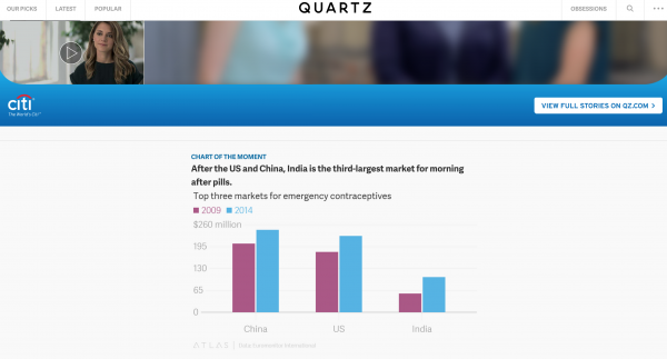 Pioneers in their use of charts, Quartz’s Chart Builder tool has been acquired by news organizations. With 10 million unique visitors per month, the guide targets what it calls “post-national business executives,” or those who travel extensively and work in countries other than their birthplace.