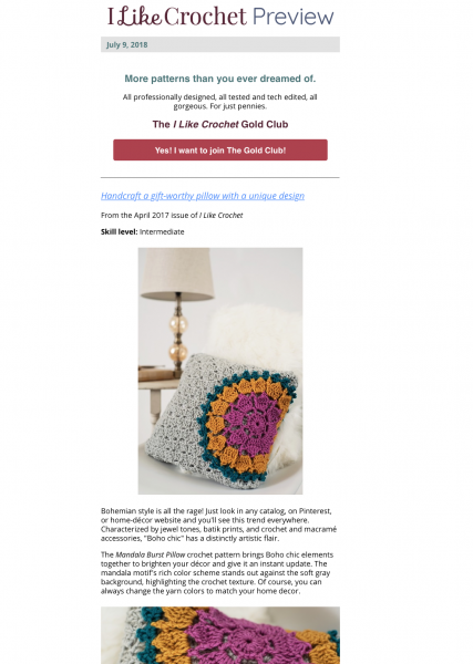 I Like Crochet has always published some content for free, but now they are releasing informational Library Previews. These are posts, also distributed through email, that preview content from the library in an effort to shed light on what’s available for those who aren’t subscribed, and curate content for those who are. Many of our clients use the preview format to tease collections on their sites, while I Like Crochet is focusing their previews on one crochet pattern from a past issue or collection, highlighting the item and the designer.