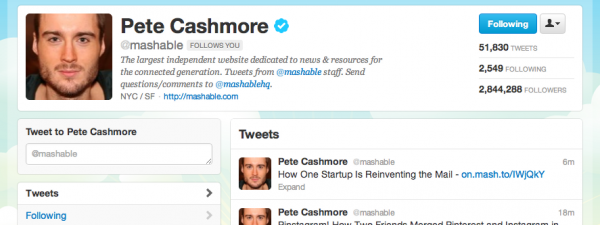 Mashable’s Pete Cashmore may be running an automated feed, but his face is the billboard for Mashable’s Twitter feed.