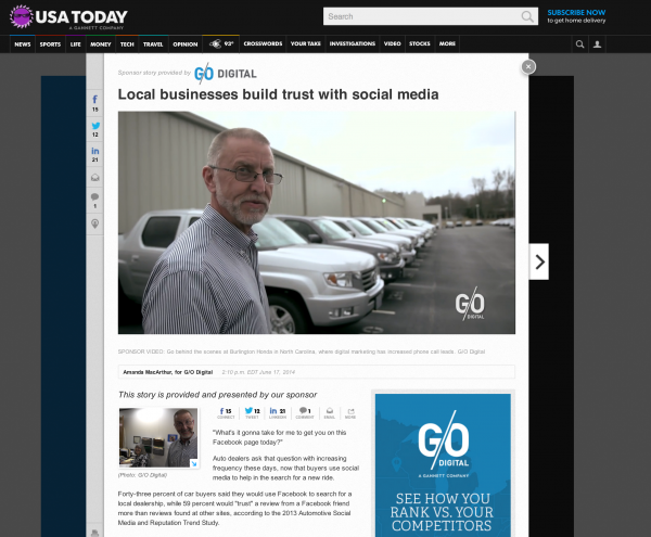 In this example on USA Today, which we’ve used many times because it’s so well structured, the news article is being sponsored by G/O Digital, and it’s clearly stated at the top of the article, in the byline and at the beginning of the article. G/O Digital also receives a banner ad on the article itself.