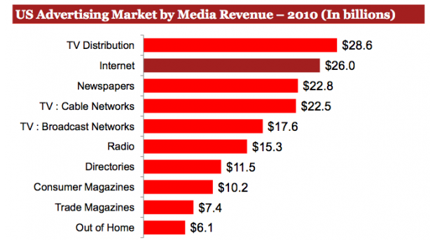 According to IAB’s 2010 Internet Advertising report, businesses spent about $26 billion on web advertising, and only $22.8 billion in newspaper advertising.