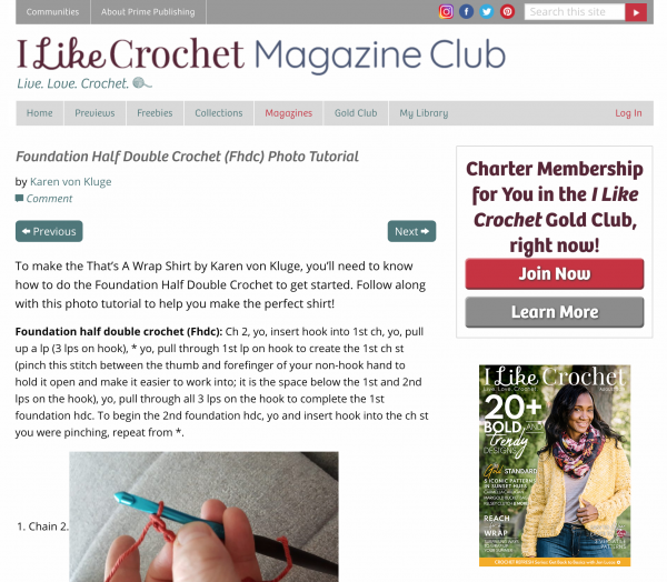 Our next example is I Like Crochet, a subscriber-driven web magazine that caters to a large community of avid crocheters looking for patterns and ideas.