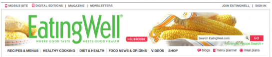 Eating Well, like Forbes, also uses those very tippy-top links above the logo to house links offering subscriptions along with a link to their free newsletters. There’s also a small red button to subscribe immediately to the right of the logo.